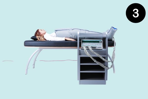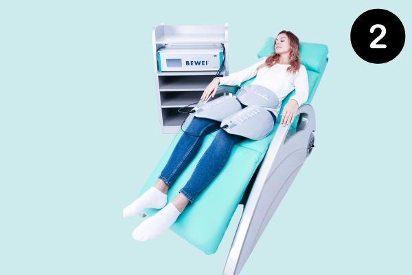 Die hoch effektive patentierte Radiofrequenz-Technik von BEWEI überträgt sanfte elektromagnetische Wellen mittels 4 Applikatoren an Bauch, Beine und Po – nicht invasiv und entspannt im Liegen.